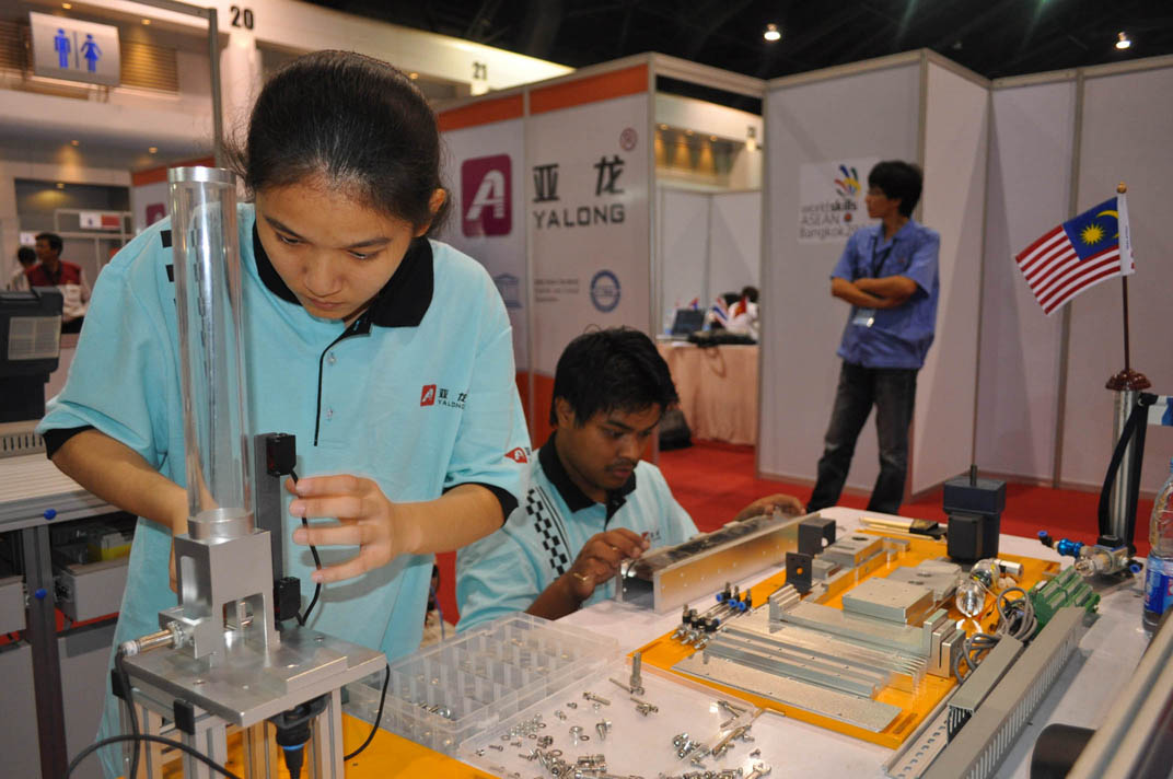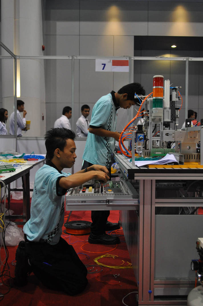 比賽內容分機械裝配、電路氣動和程序編寫三部分,參賽選手每天完成一項內容后,專家裁判組進行打分,三天賽程結束后統計總成績。來自新加坡、馬來西亞、印度尼西亞、越南、老撾、泰國、菲律賓等東盟成員國組隊和1支中國江蘇無錫機電高等職業技術學校代表隊同臺競技。隨著裁判長一聲哨響,選手們像運動競技一樣快速跨過黃色警戒線,沖向插有自己國家國旗的工位上開始操作。賽場黃色警戒線外的通道里,來自亞龍的技術人員各就各位,隨時準備為大賽提供自己精湛的技術服務。