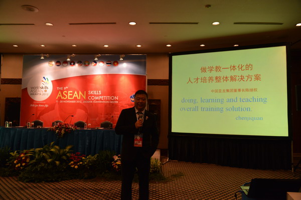 上午在東盟技能大賽會議中心,陳董為大賽代表做《做學教一體化人才培養整體方案》的專題報告,并受到了代表的熱烈歡迎。與會代表老師們及同學們與陳董進行了互動,他們非常希望能夠來到亞龍,來到中國進行學習和培訓亞龍的技術。陳董一一向他們進行了介紹 ,陳董也非常希望中國的職業院校、技工院校能與亞龍合作,共同開展向東盟國家培養老師與學生,讓我們中國職業教育走向東盟,走向世界。