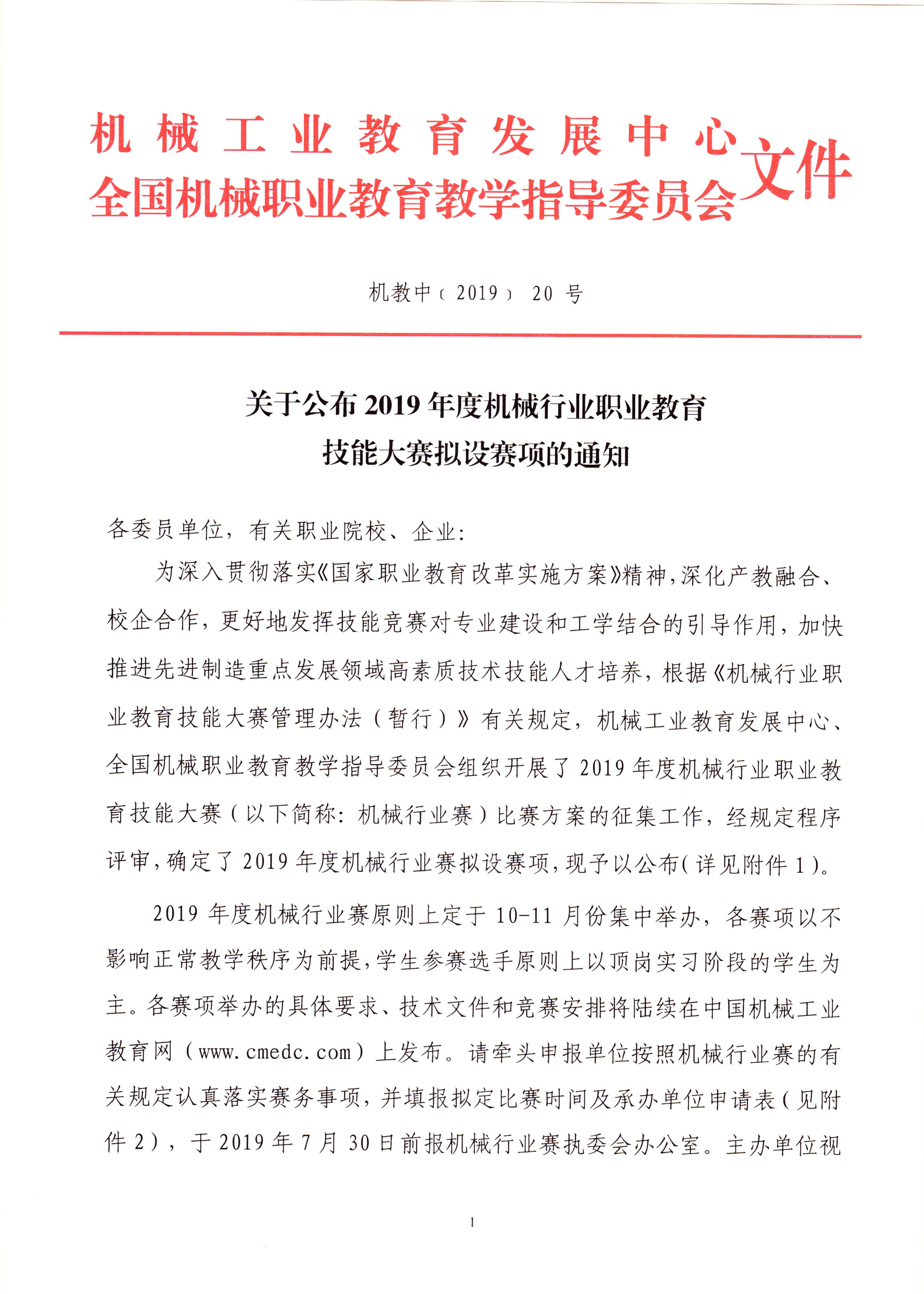 關于公布2019年度機械行業職業教育技能大賽擬設賽項的通知
