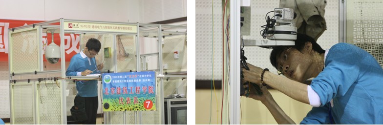 此次比賽的題目是在亞龍YL-712型建筑電氣與智能化實踐教學模擬樓層上,按照圖紙分別安裝監控系統、安防系統和門禁系統,并且通過對線路的反復調試測算,使其達到應有的報警、監控效果。在競賽中,要求2名選手分工合作,協作配合,精心安排,共同完成系統的安裝與調試。評委們以安裝速度,線路調試,排線外觀為標準進行評比。由于工程量較大,線路較為繁多復雜,要想以速度取勝并不是一件很容易的事情。