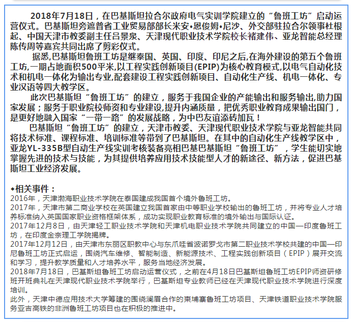 巴基斯坦“魯班工坊”啟動運營儀式——亞龍YL-335B型自動生產線實訓考核裝備亮相巴基斯坦“魯班工坊”!
