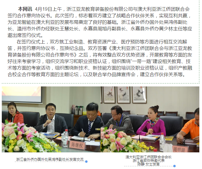 浙江亞龍教育裝備股份有限公司與澳大利亞浙江僑團聯合會簽約合作意向協議書