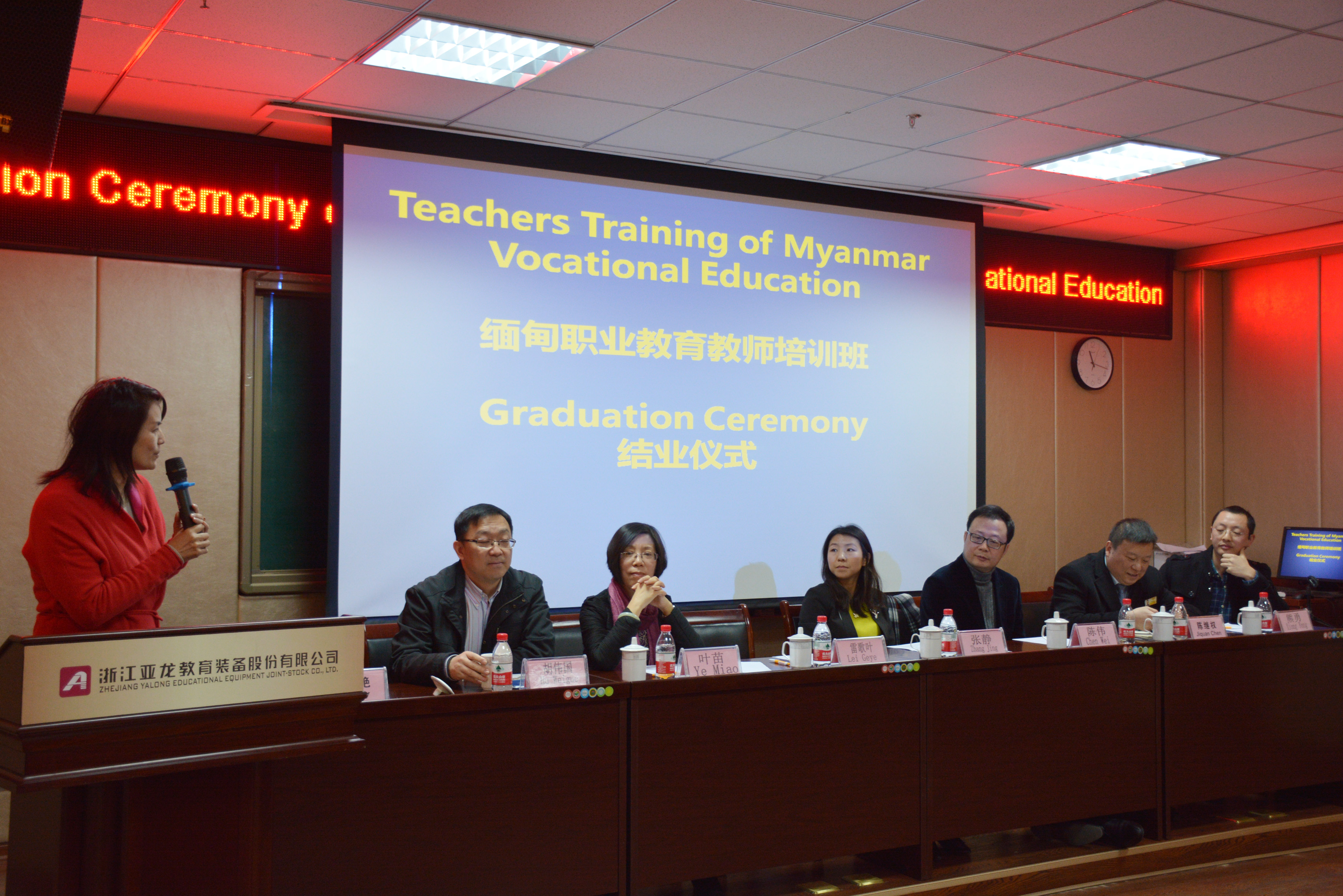 同時,在12月29日的緬甸職業(yè)教育教師培訓班結業(yè)儀式上,來自中國教育部國際合作與交流司/中國-東盟中心的張靜女士、中緬友好協(xié)會的雷歌葉女士、溫州市教育局國際處處長陳偉、溫州大學外事處處長葉苗、亞龍裝備董事長陳繼權等等嘉賓均出席并發(fā)言致辭。結業(yè)儀式首先通過一段回顧視頻來總結這段培訓時間里的點點滴滴,緬甸老師在看到回顧視頻之后,或感動、或歡笑,回憶著這充實忙碌的培訓過程。之后由出席嘉賓及領導為緬甸職業(yè)教育教師培訓班的學員頒發(fā)結業(yè)證書,以及為優(yōu)秀學員頒獎。