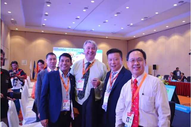 世界技能大賽主席西蒙·巴特利與亞龍出董事長陳繼權等在東盟技能大賽賽前會議合影留念